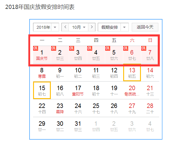 國(guó)慶節(jié)放假時(shí)間:10月1日(星期一)至10月7日(星期天)放假共7天。